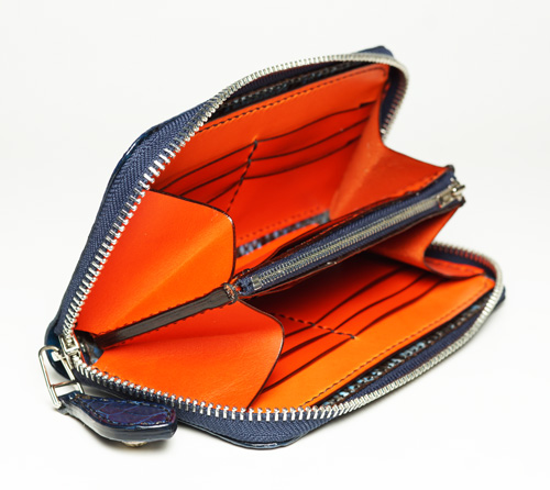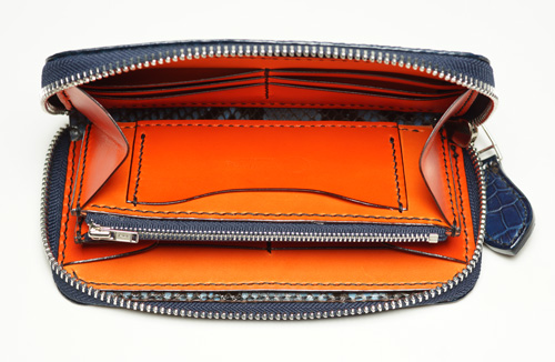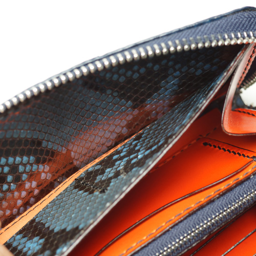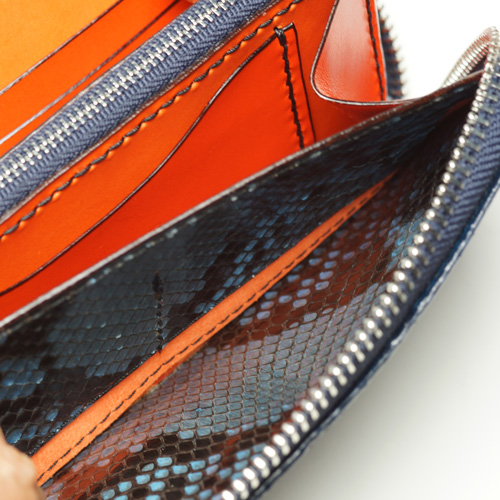 中パーツ:両サイドカード入れ オレンジ、コバ色入れ、小銭入れ横ポケット、小銭入れ内側・内張り・カードケース裏:パイソン青