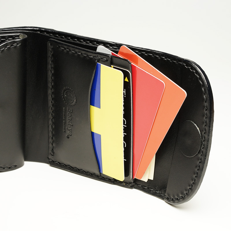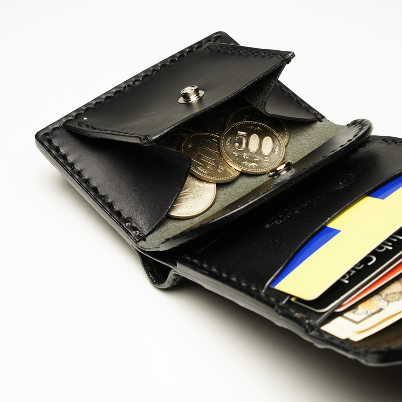 コンパクトなサイズながら、札入れ、小銭入れ、カード入れを装備。しかひも止め。
