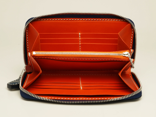 中パーツ:両サイドカード入れ 黄色(マチ緑)、コバ 赤茶 色入れ、ファスナーカラーチェンジ、小銭入れ横ポケット
