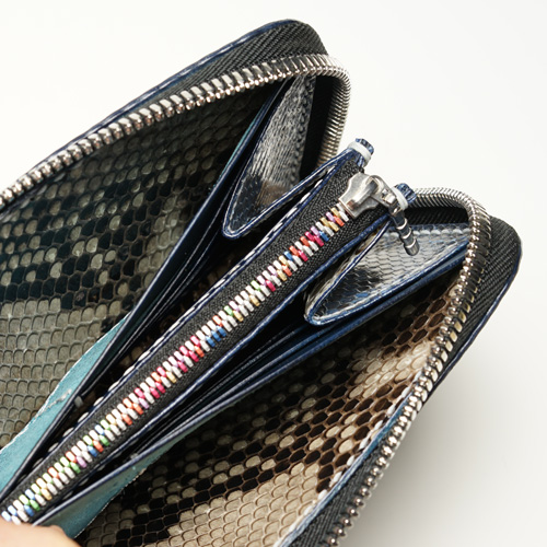 外側マチ:パイソン青、内側マチ:パイソンナチュラル、内張り:パイソンナチュラル、小銭入れ内側:パイソンナチュラル