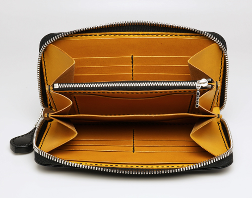 中パーツ黄色、ステッチ 外:黒・中:黄色、コバ 赤茶 色入れ、小銭入れファスナー:黄布×銀コマ