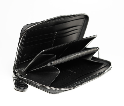 T字革土台なし、持ち手・土台スモールコンチョなし、ウォレットリングなし、ファスナー:黒布×ブラックシルバーコマ