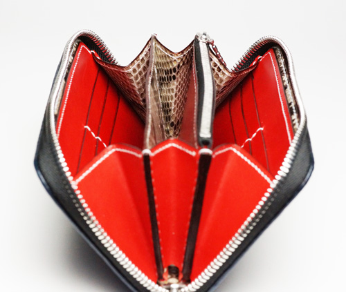 中パーツ:両サイドカード入れ コードバンバーガンディ、小銭入れ横ポケット、内張り:パイソンナチュラル