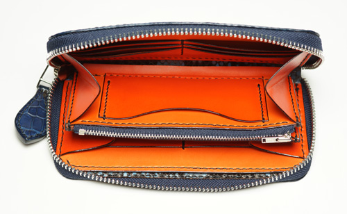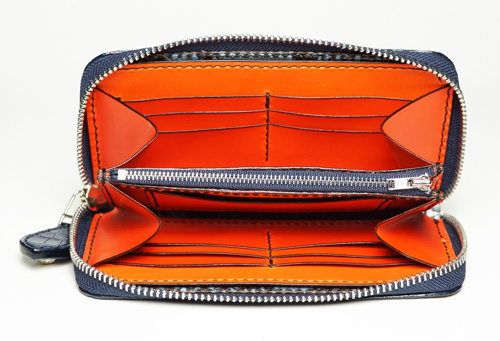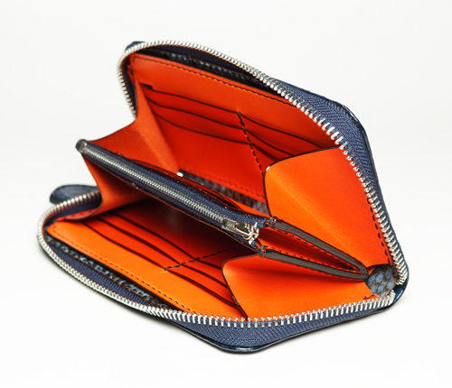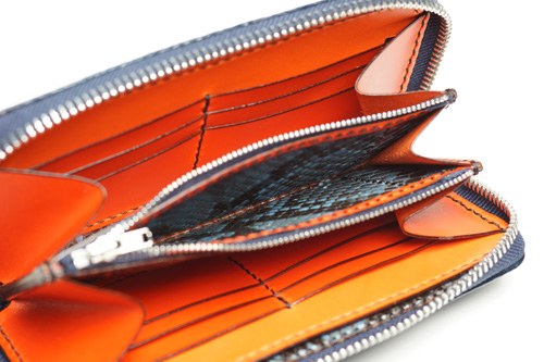 中パーツ:両サイドカード入れ オレンジ、コバ色入れ、小銭入れ横ポケット、小銭入れ内側・内張り・カードケース裏:パイソン青