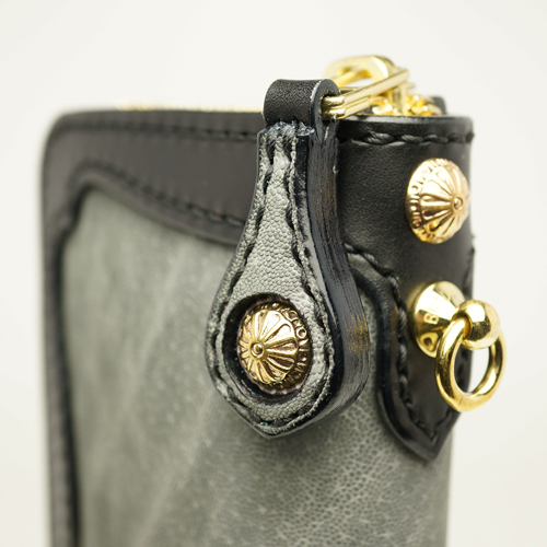 手持ち・土台スモールコンチョ:ブラスフラワー、ウォレットリング:ブラスウォレットリング、ダブルカット:デザイン変更、ファスナー:ブラック×ゴールド