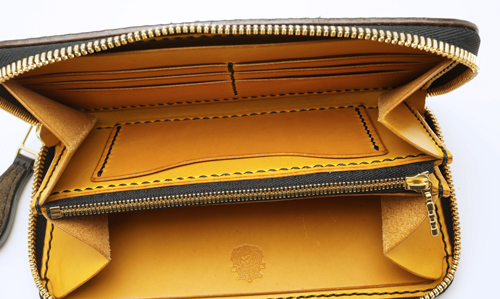 持ち手:オリジナルブラススモールコンチョ、ファスナー:黒布×金コマ